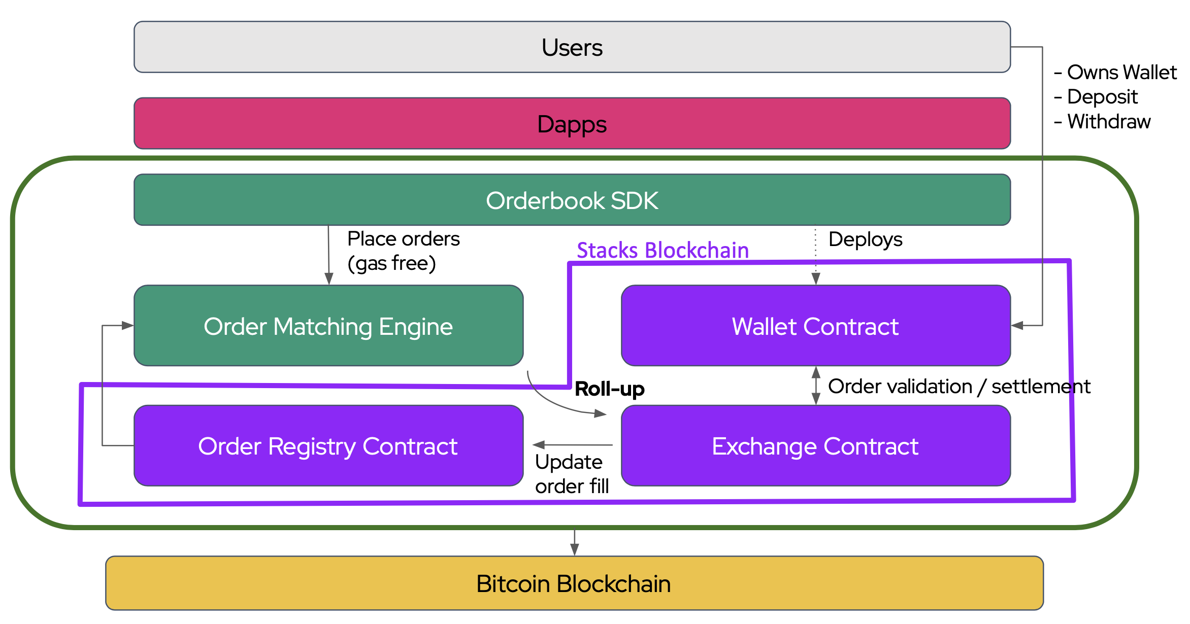 Orderbook uses a hybrid on-chain/off-chain design, whereby a commitment to buy or sell certain asset is communicated in a cryptographically signed message, which is then matched by an off-chain matching engine before settling on-chain.