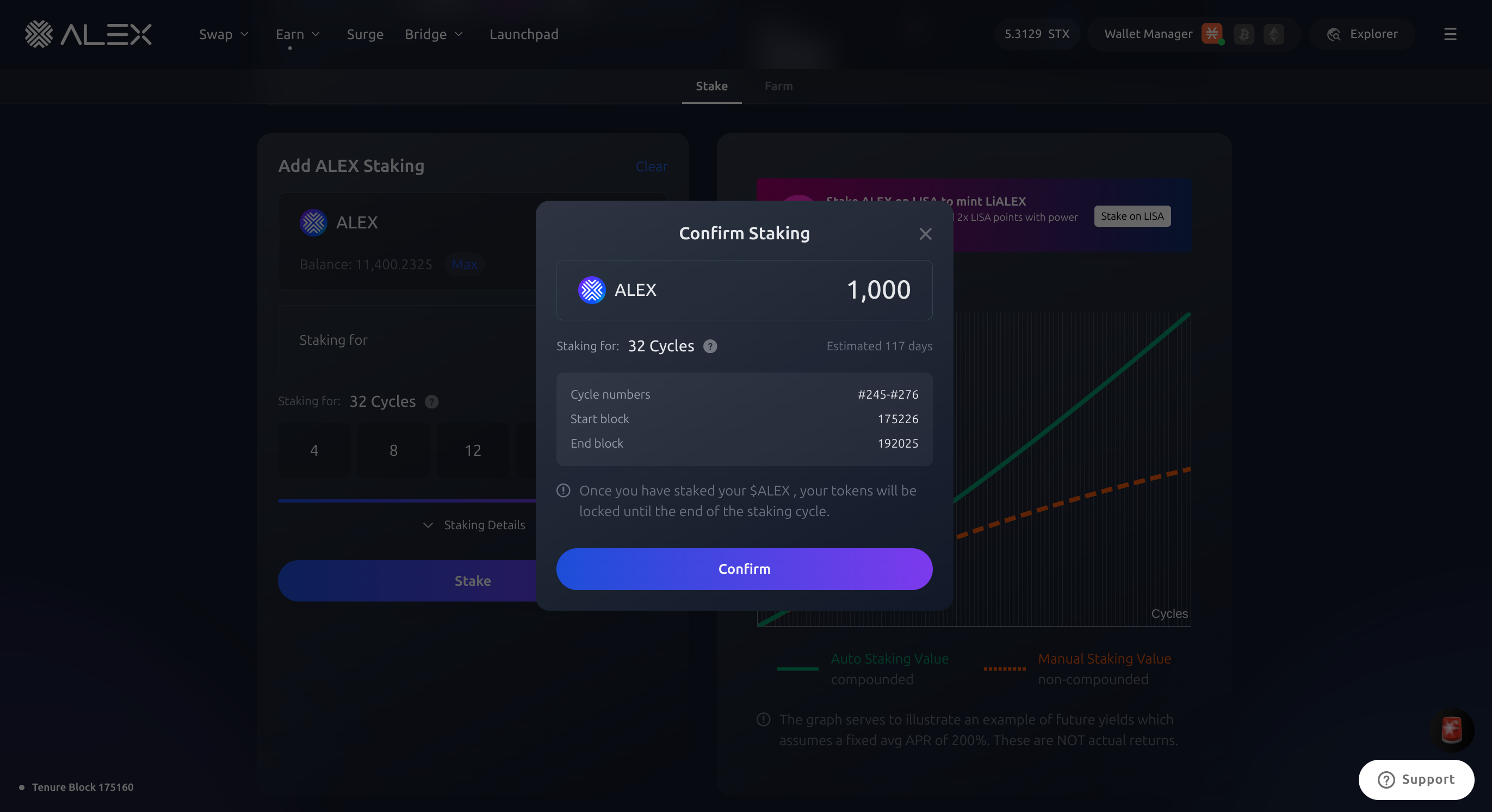 Staking on ALEX requires a few easy steps. In short, it consists of locking up your tokens temporarily to earn rewards. In staking, time is measured in cycles, and at the end of each cycle, you will be able to harvest your rewards. At that point, you may choose to transfer rewards to your wallet or to proceed to Liquid Staking with LiALEX.