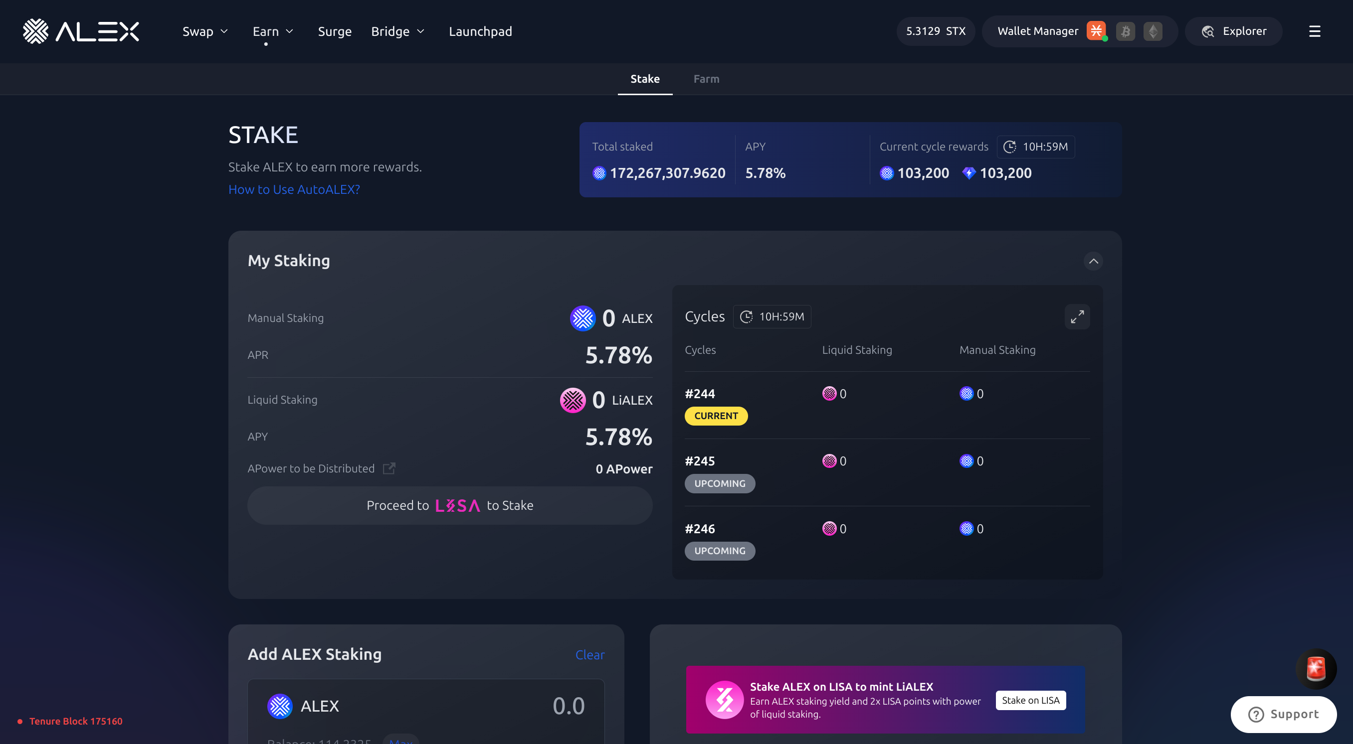 - Manual Staking: The amount of $ALEX you are currently staking.