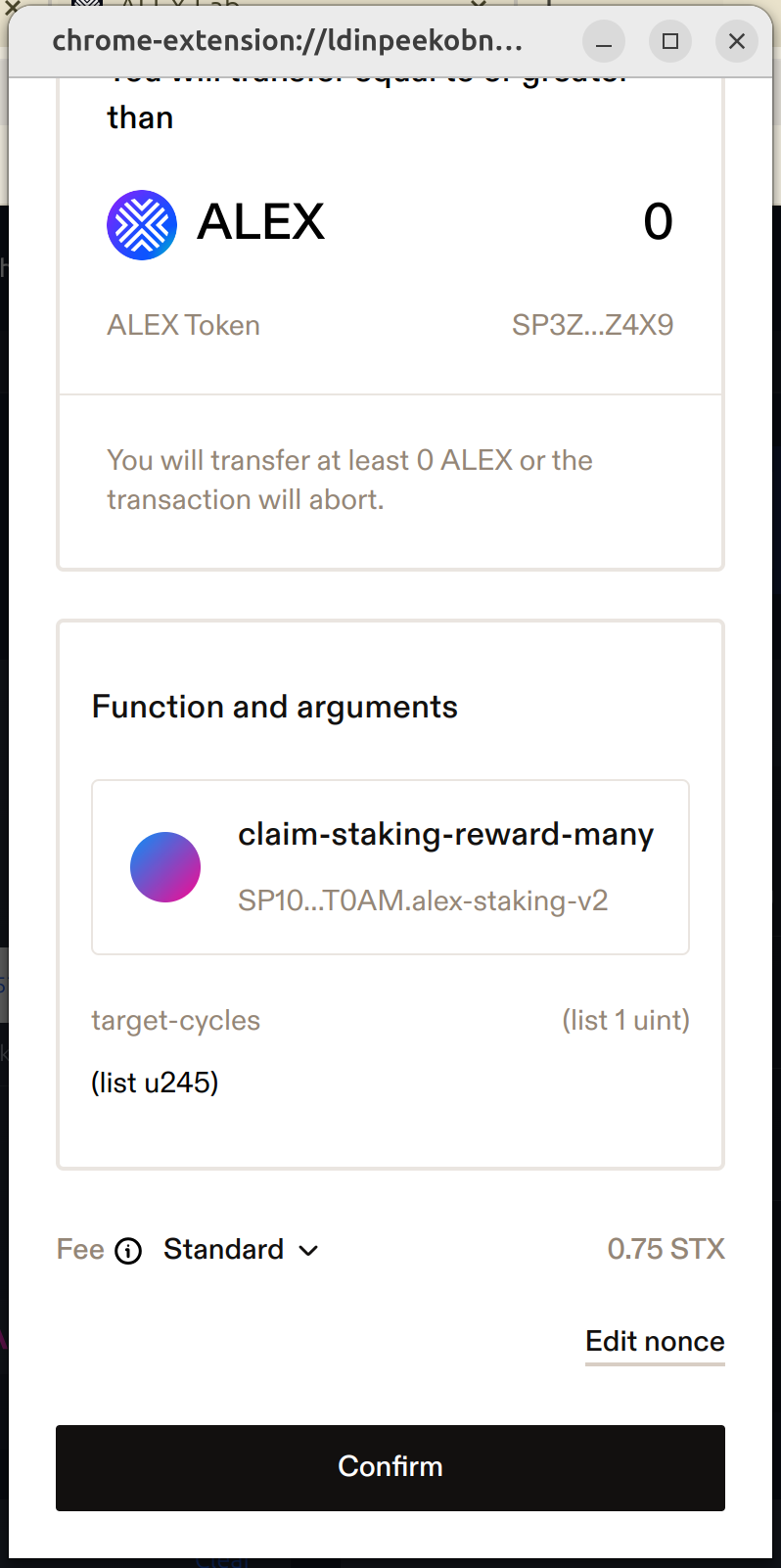 Here, your Stacks wallet is interacting with ALEX smart contract and is asking you for approval. Scroll through the wallet transaction window, review it and confirm the transaction. By doing this, you are allowing the wallet to sign and broadcast the transaction.