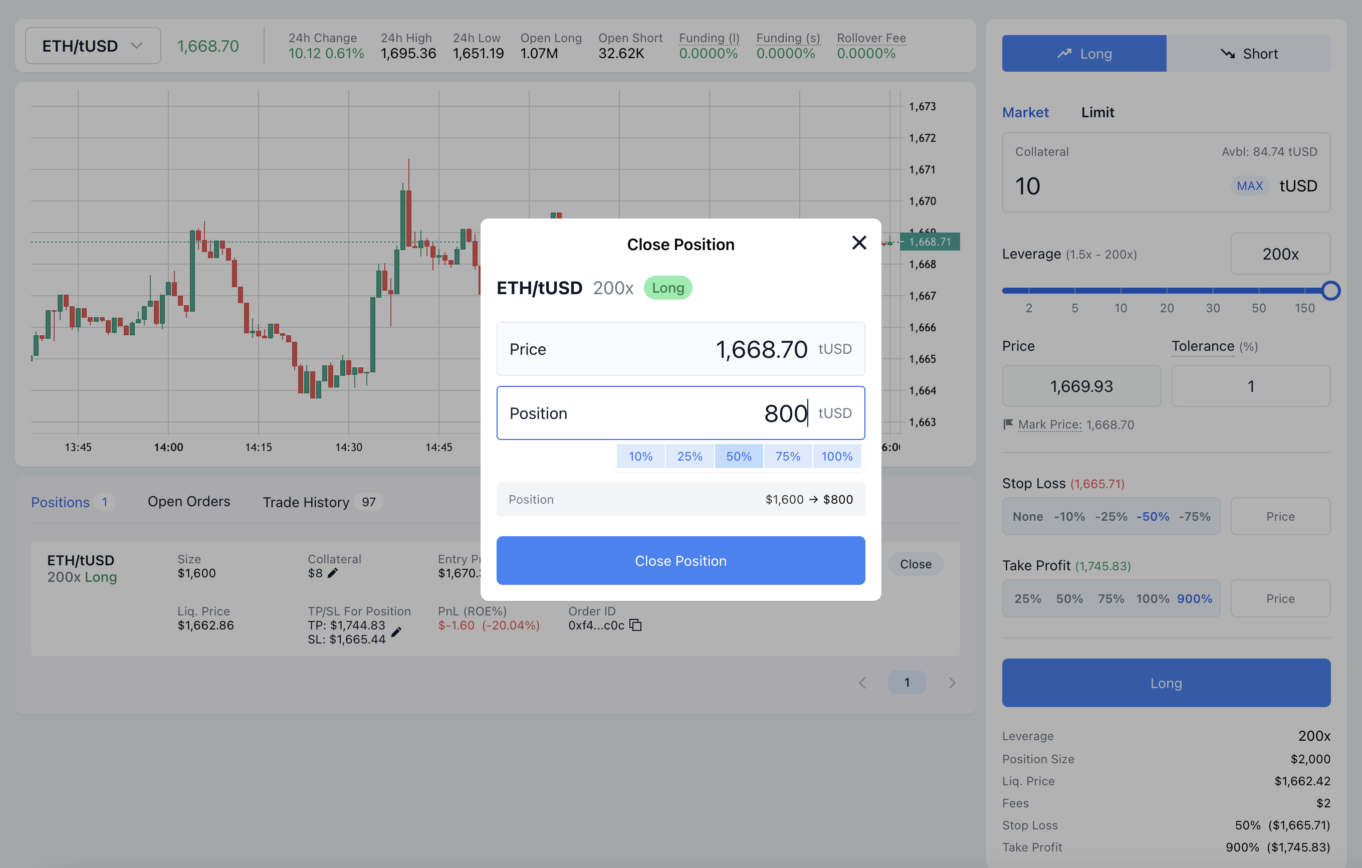 Closing a position will calculate the PnL based on the best price offered by the Liquidity Pool and transfer it to the trader, together with the margin posted.