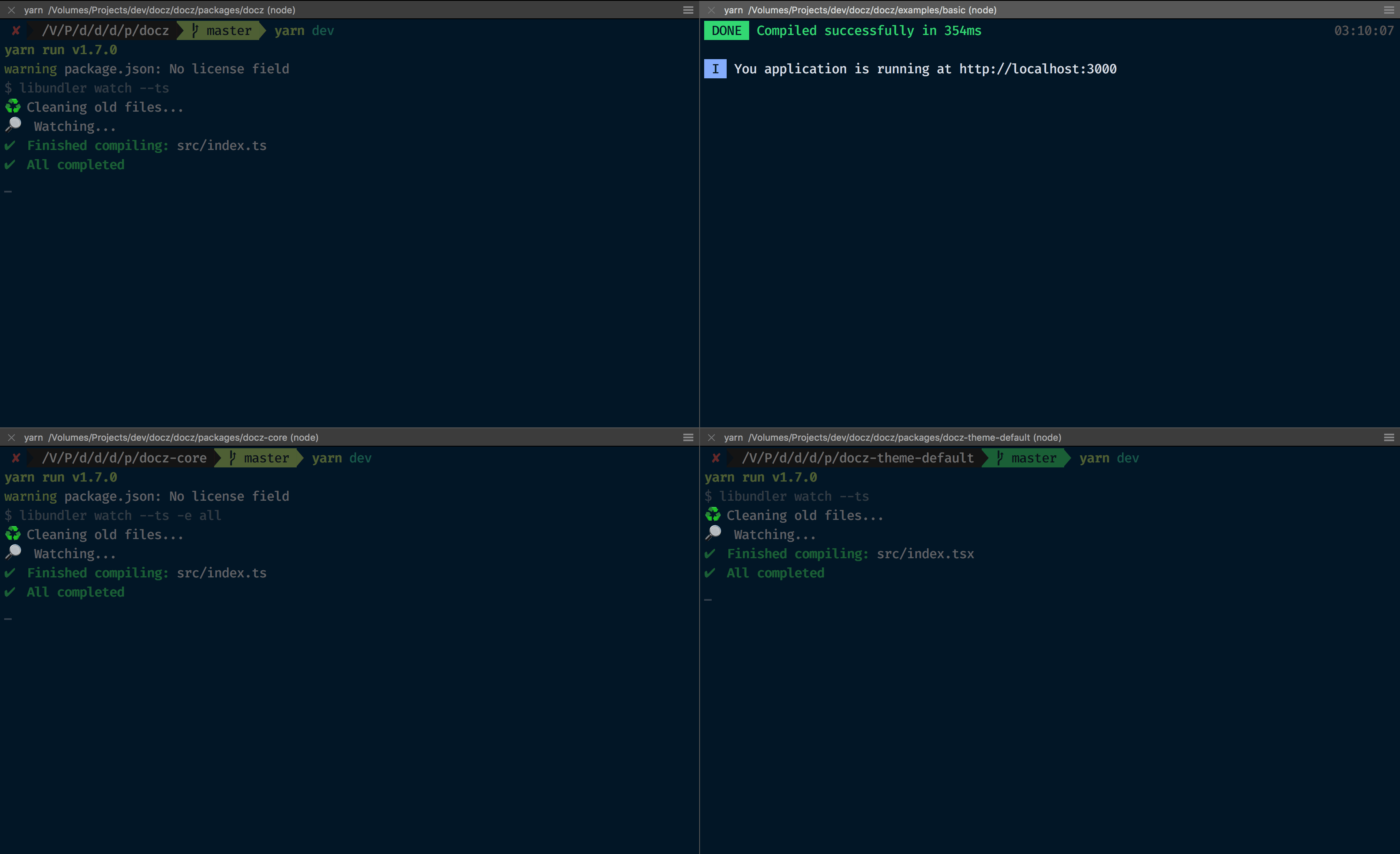 In the above example you're watching docz, docz-core and docz-theme-default and also running docz-example-basic. So any modifications made to any of those packages will reflect in basic example on the fly!