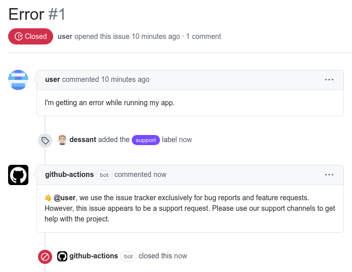 A GitHub App that comments on and closes issues labeled as support requests.