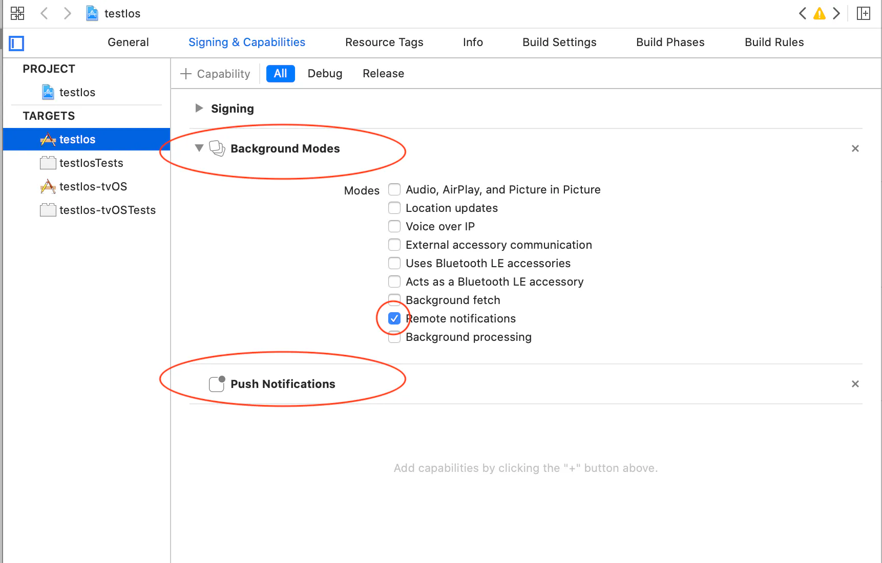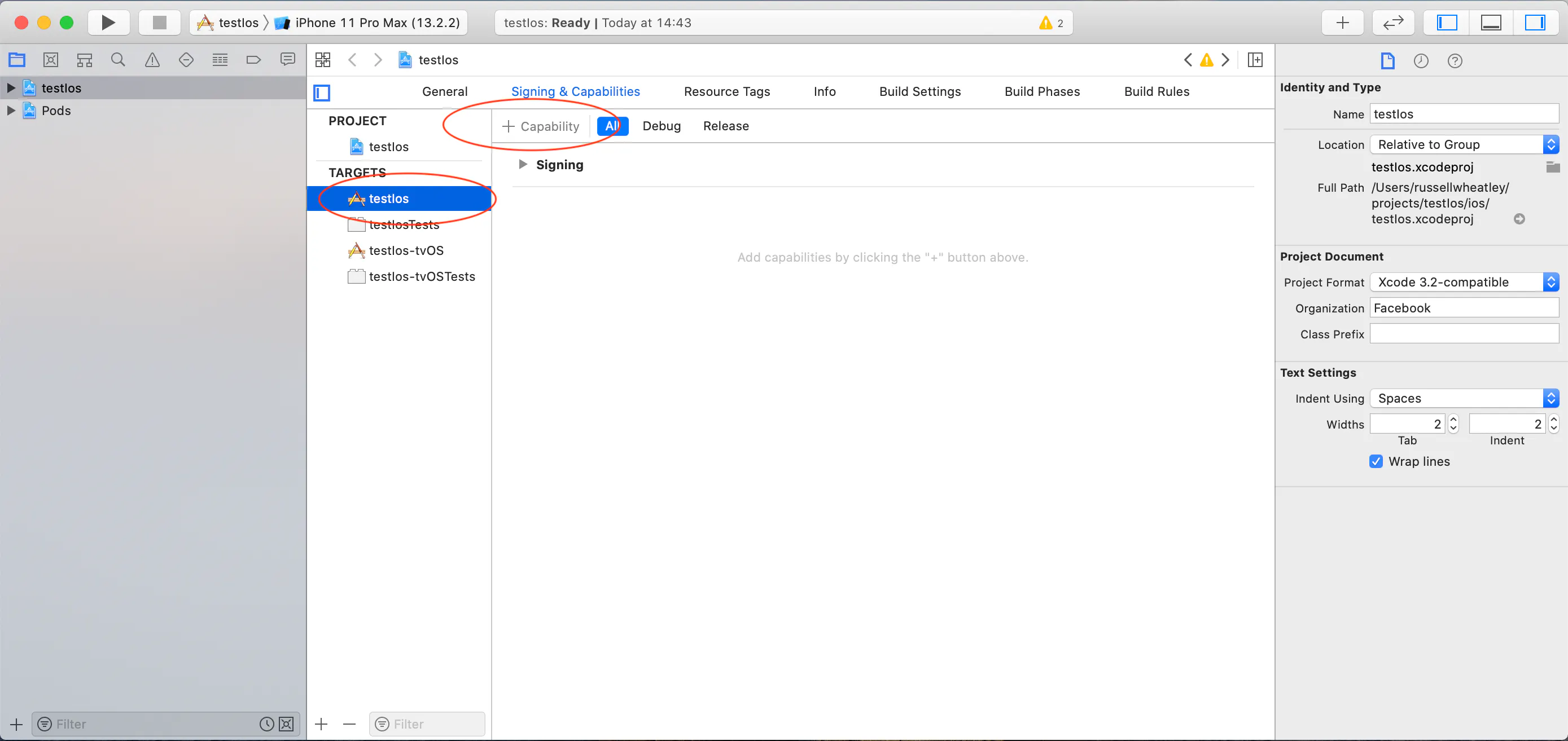 Click the target which is the name of the project, in this instance, the name is testIos. Then click + Capability.