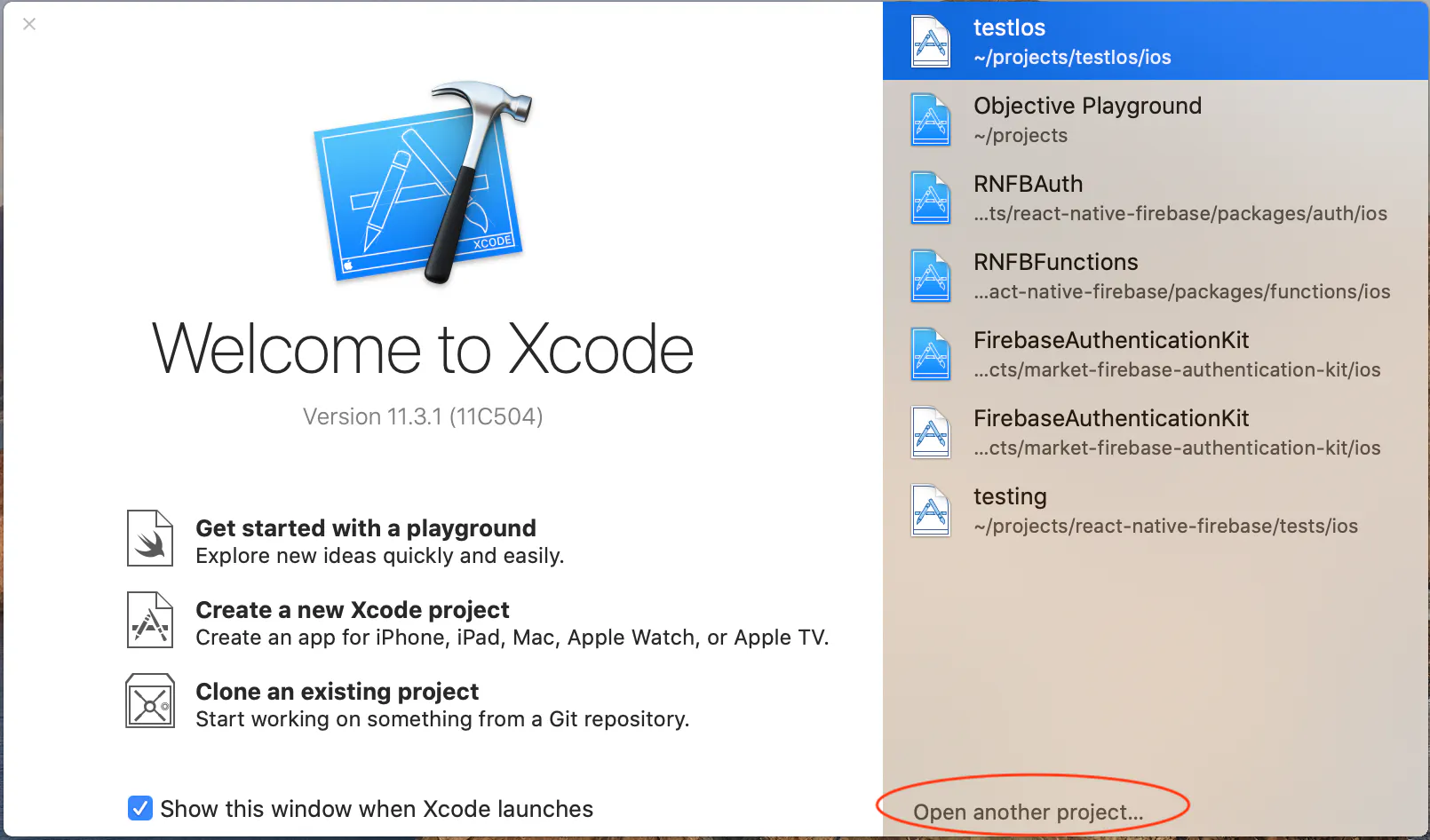 Open your react native project in Xcode. Click Open another project...