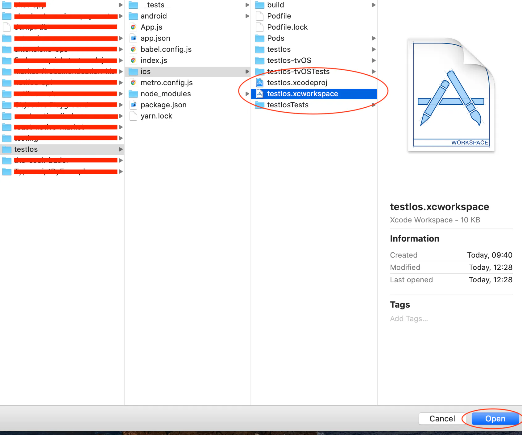 Open path/to/project/testIos/ios/testIos.xcworkspace and click open